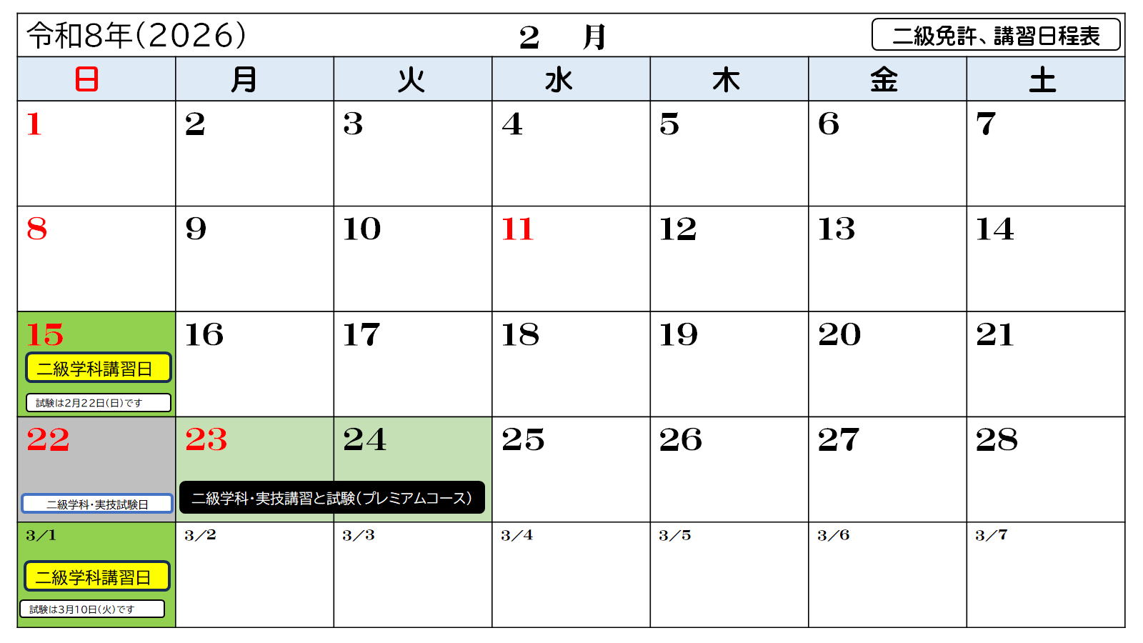 01月11日(日) ② | ▶▶02月16日(月)~02月21日(土) | ▶▶01月20日(火) | ←学科試験のみ実施 実技試験は2/22に実施 |
