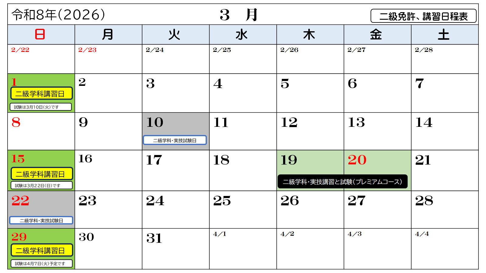 | 03月15日(日) ② | ▶▶03月16日(月)~03月21日(土) | ▶▶03月22日(日) | 3/19~20実技教習不可 | ||
