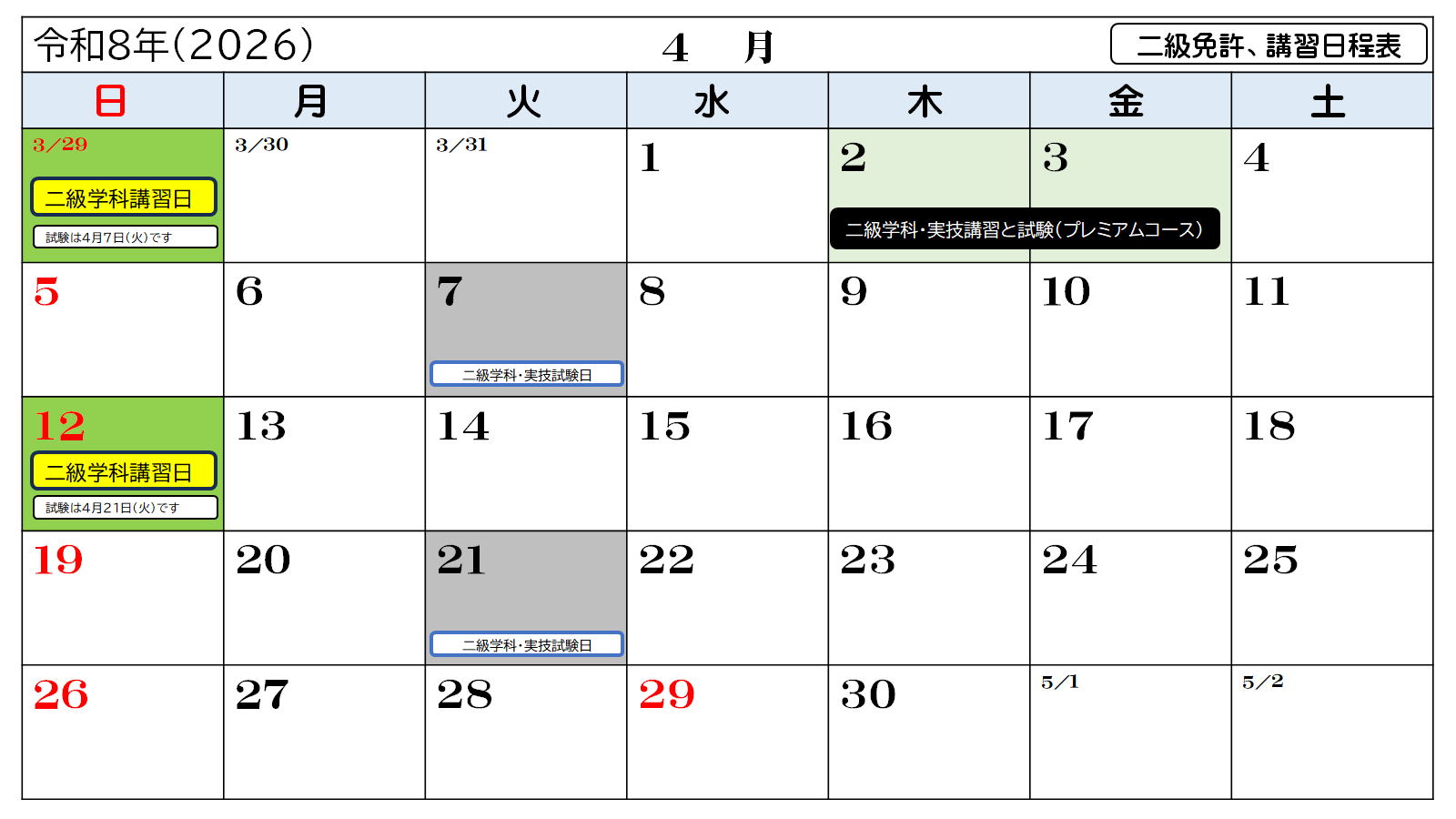 | 04月 | 04月12日(日) ② | ▶▶04月13日(月)~04月20日(月) | ▶▶04月21日(火) | 4/18~19実技教習不可 | |