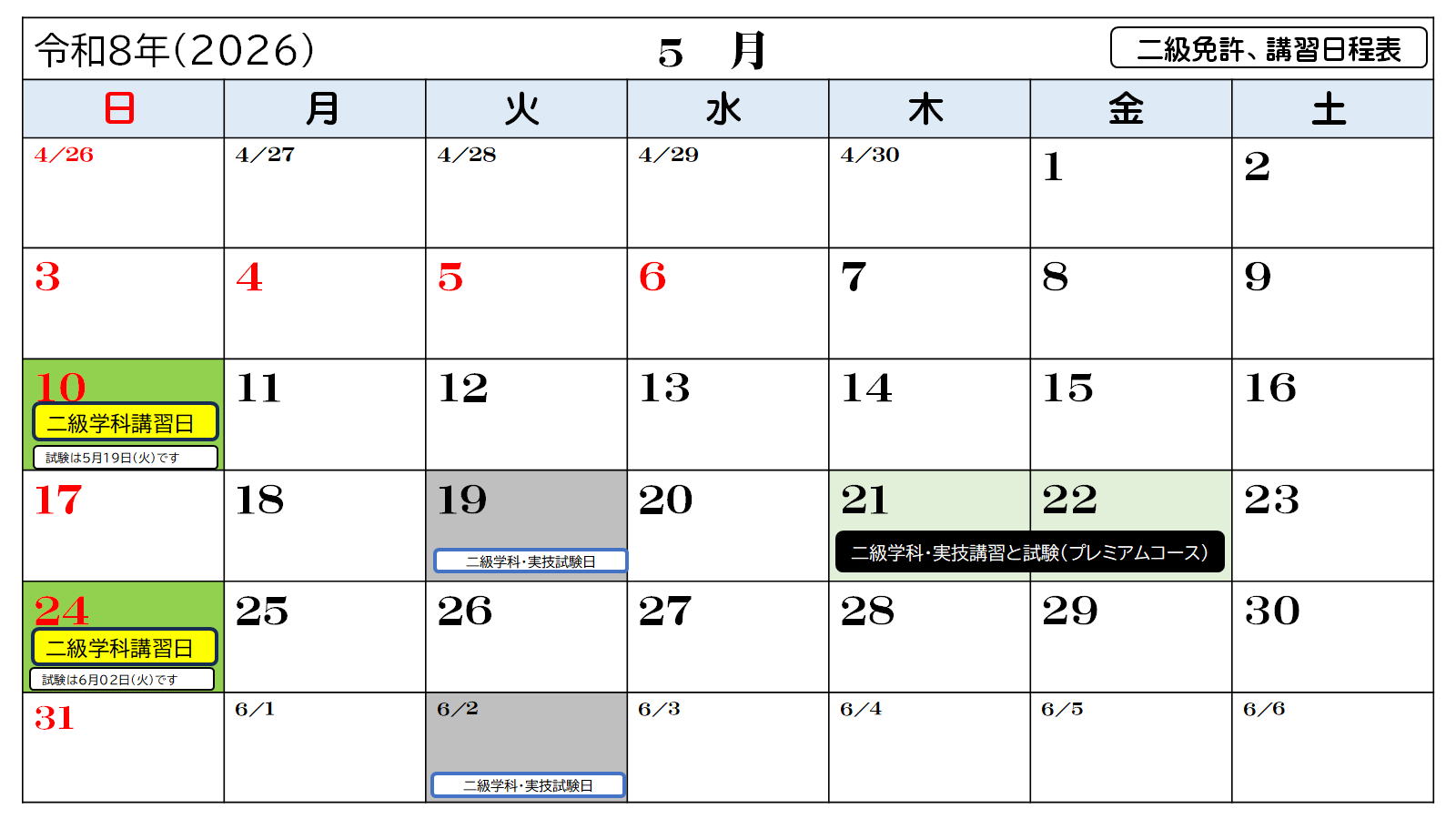 | 05月24日(日) ② | ▶▶05月25日(月)~06月01日(月) | ▶▶06月02日(火) | 5/26 と 5/31実技教習不可 | ||