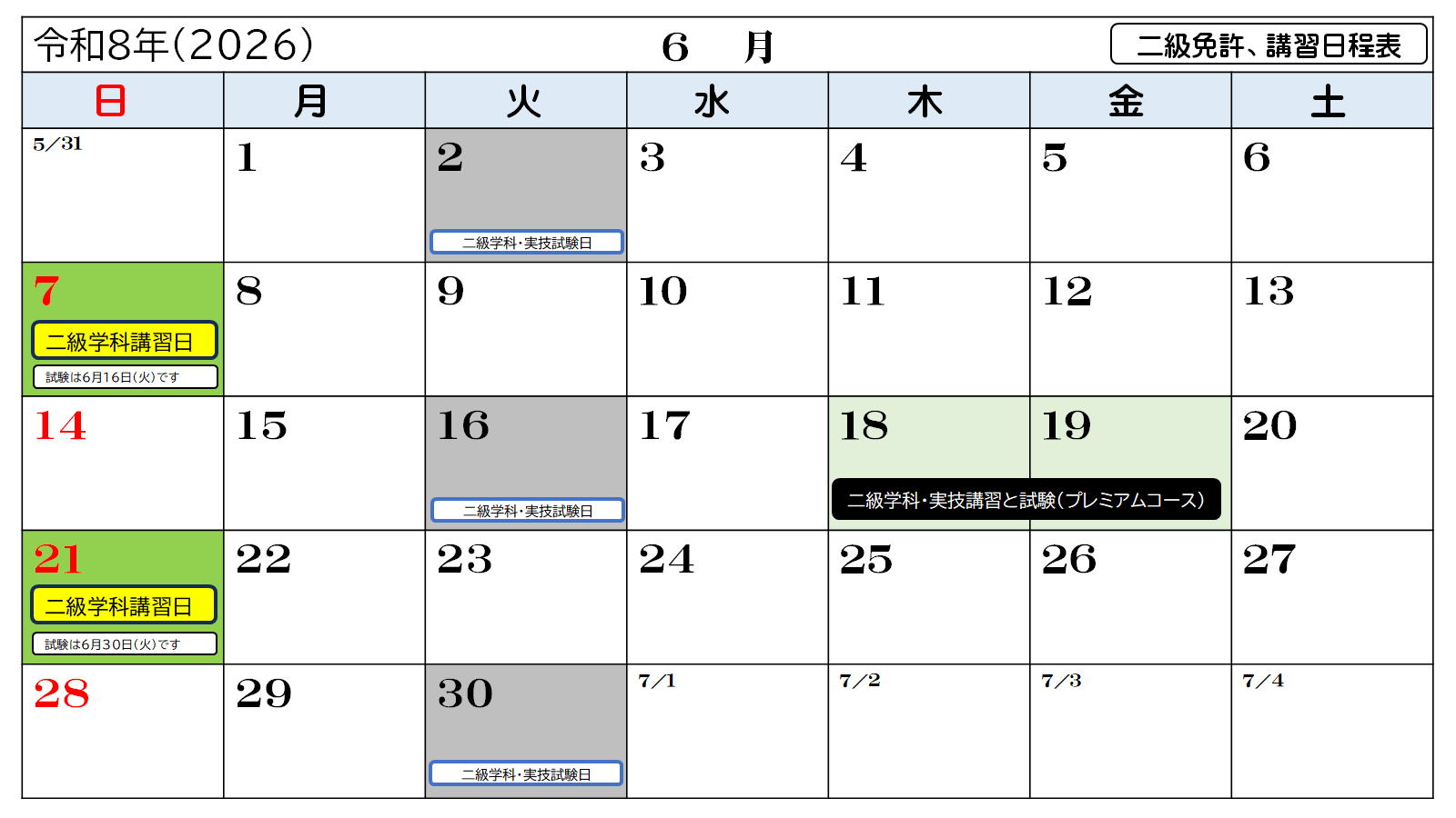 | 06月21日(日) ② | ▶▶06月22日(月)~06月29日(月) | ▶▶06月30日(火) | 6/23 と 6/27実技教習不可 | ||