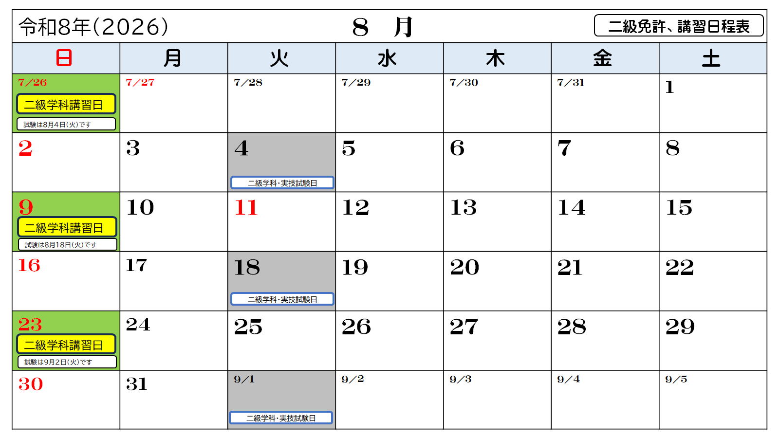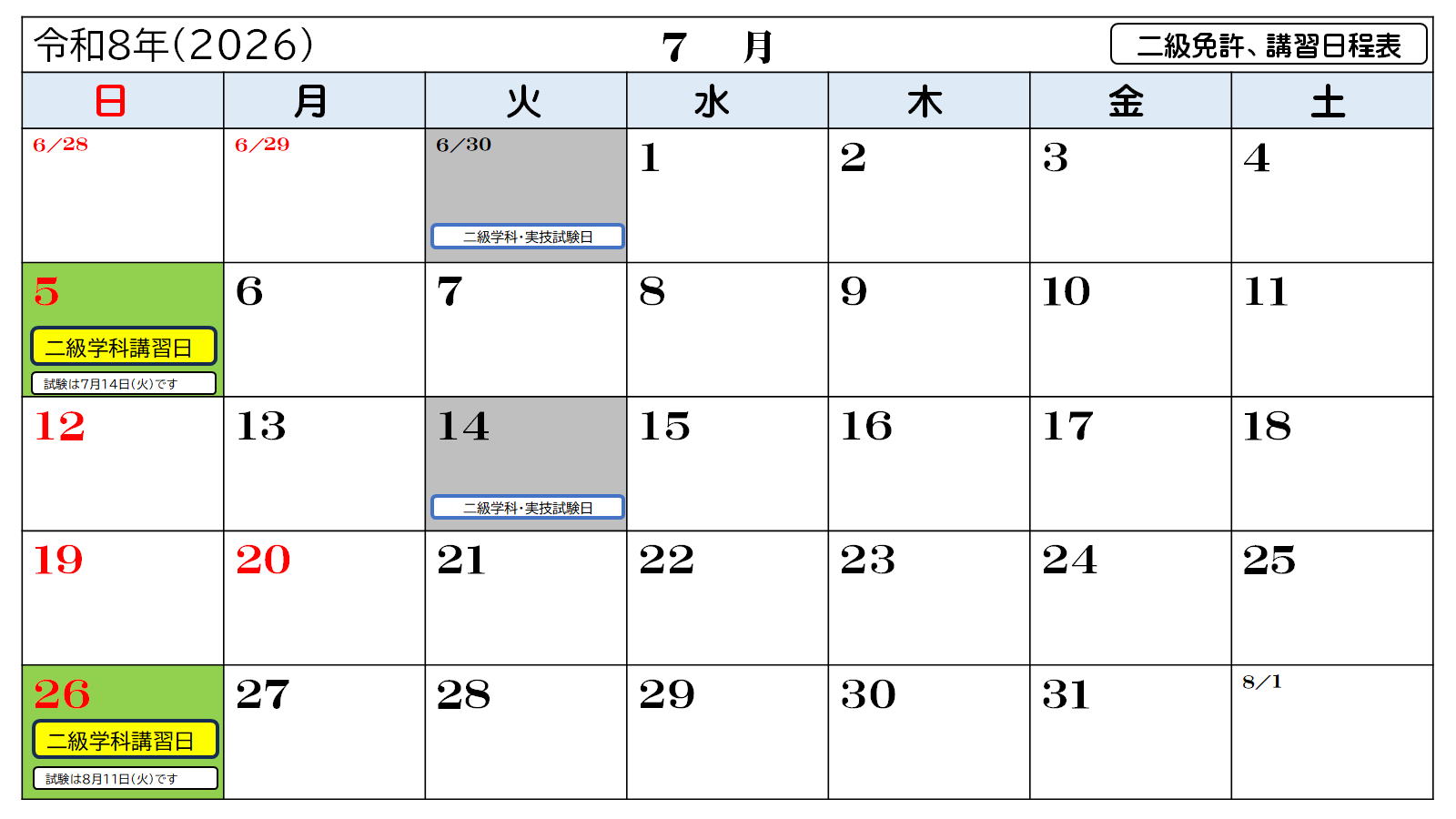 | 07月26日(日) ② | ▶▶07月27日(月)~08月03日(月) | ▶▶08月04日(火) | 8/2実技教習不可 | ||