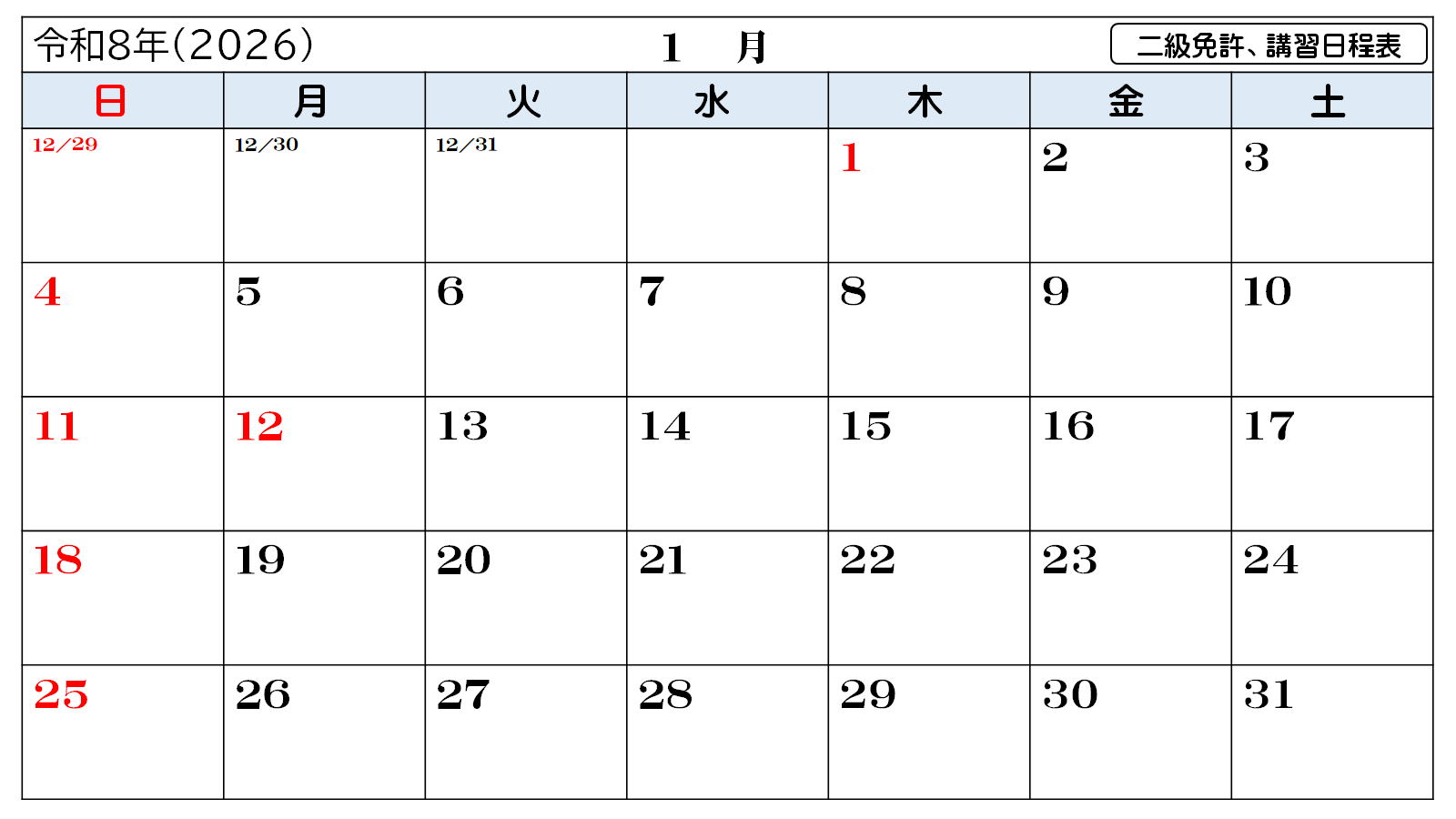 | 1月 | ・・・・・・・・・ | ・・・・・・・・ | ・・・・・・・・ | ・・・・・・・ | |