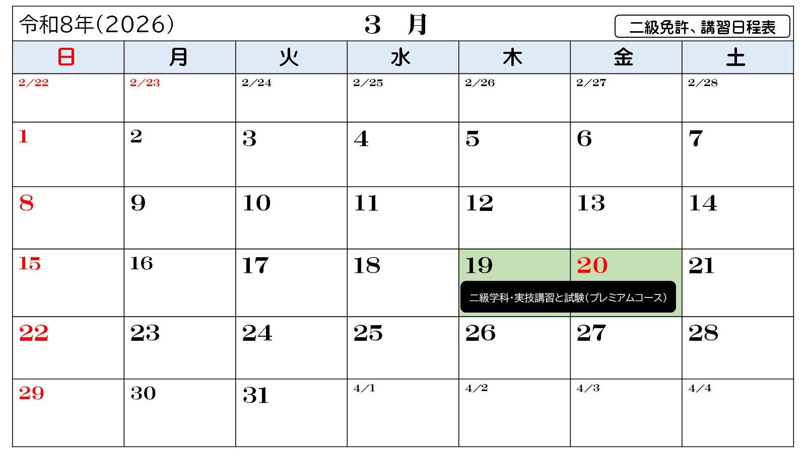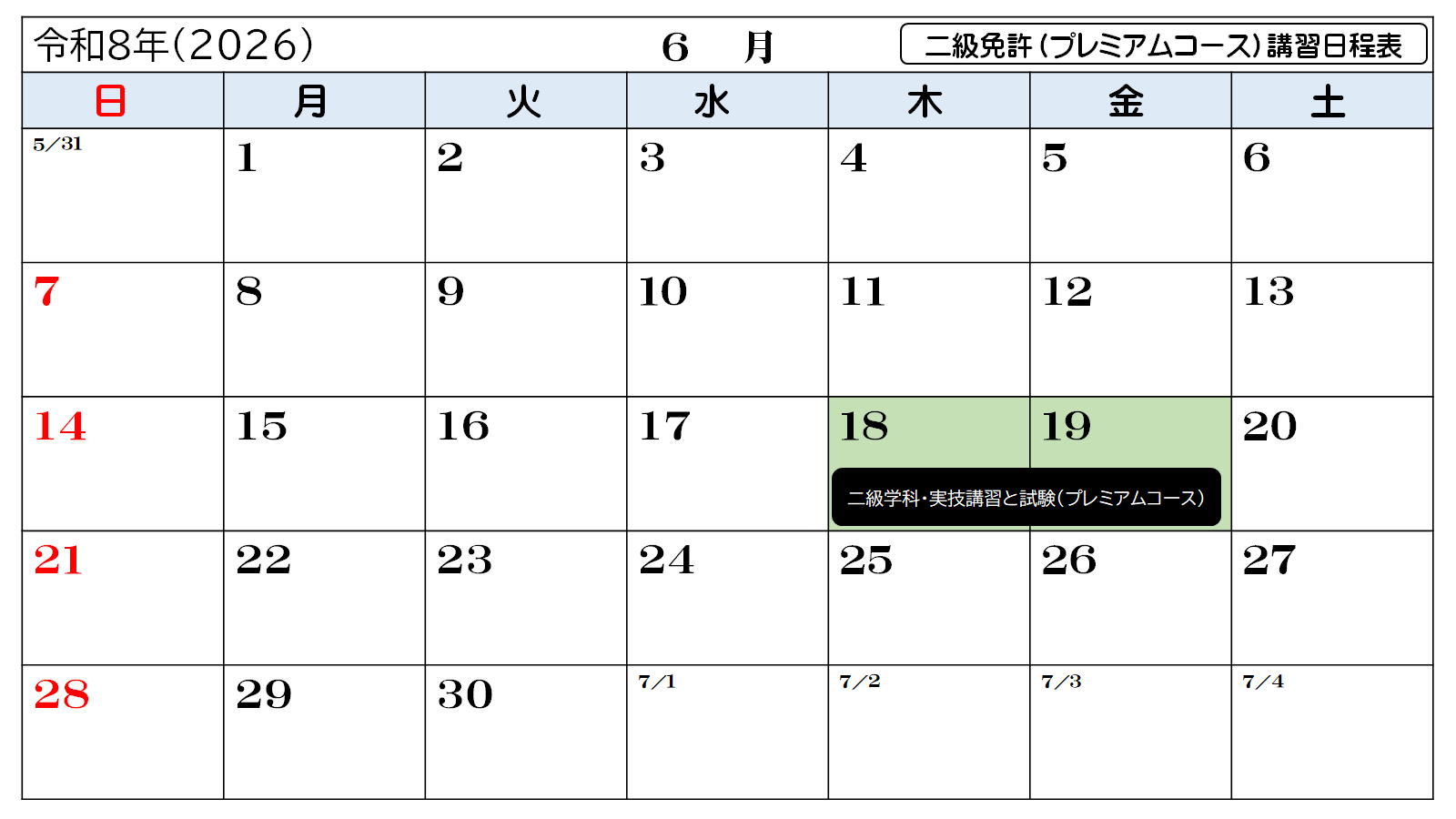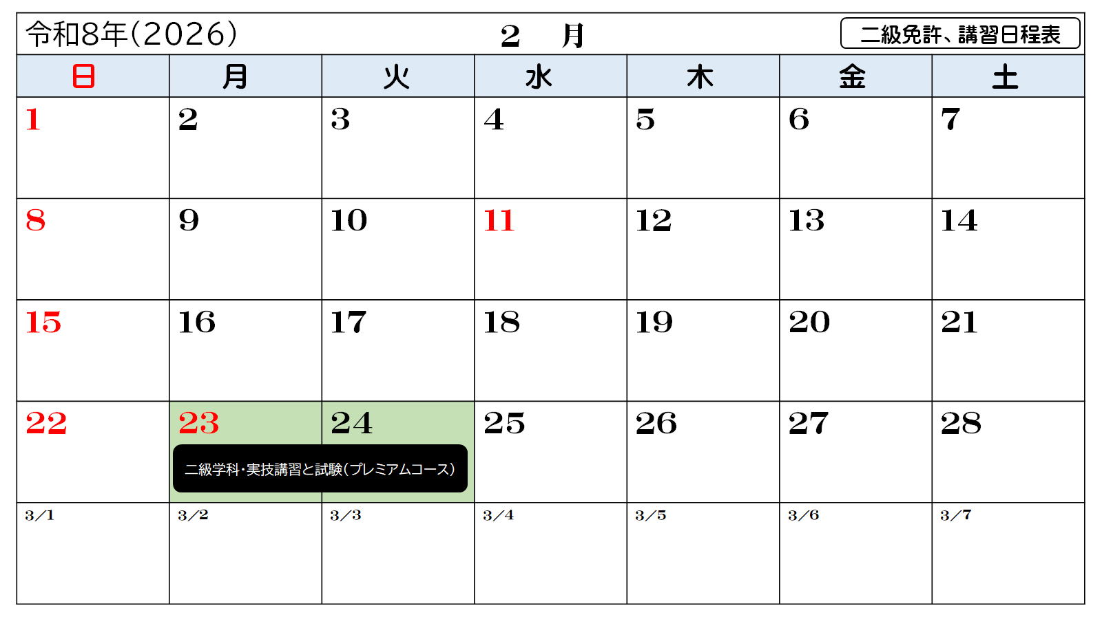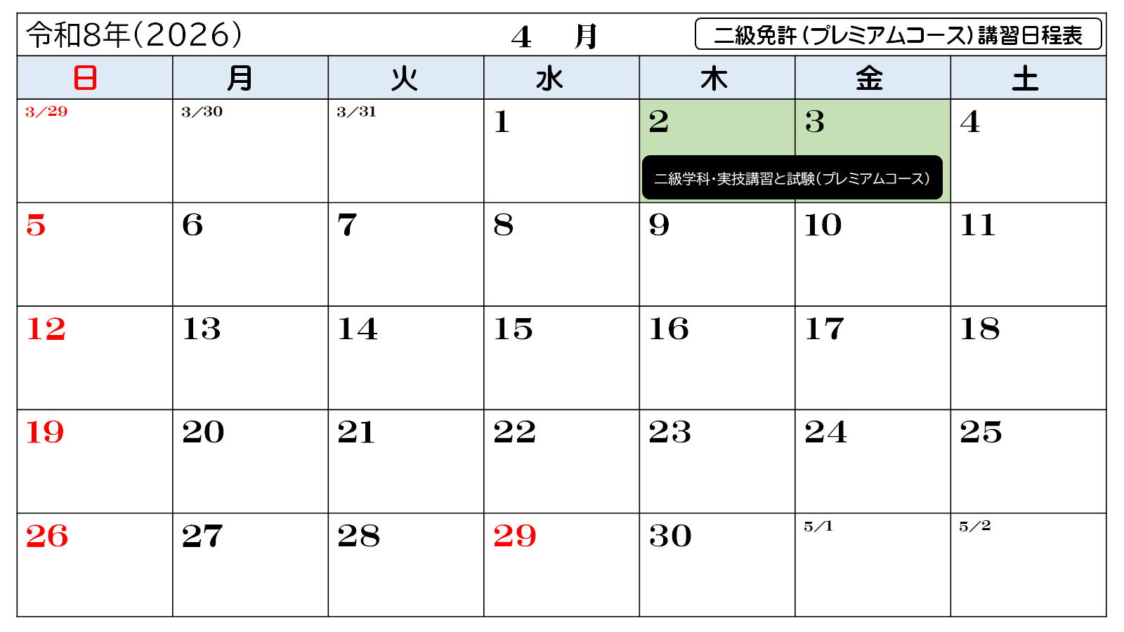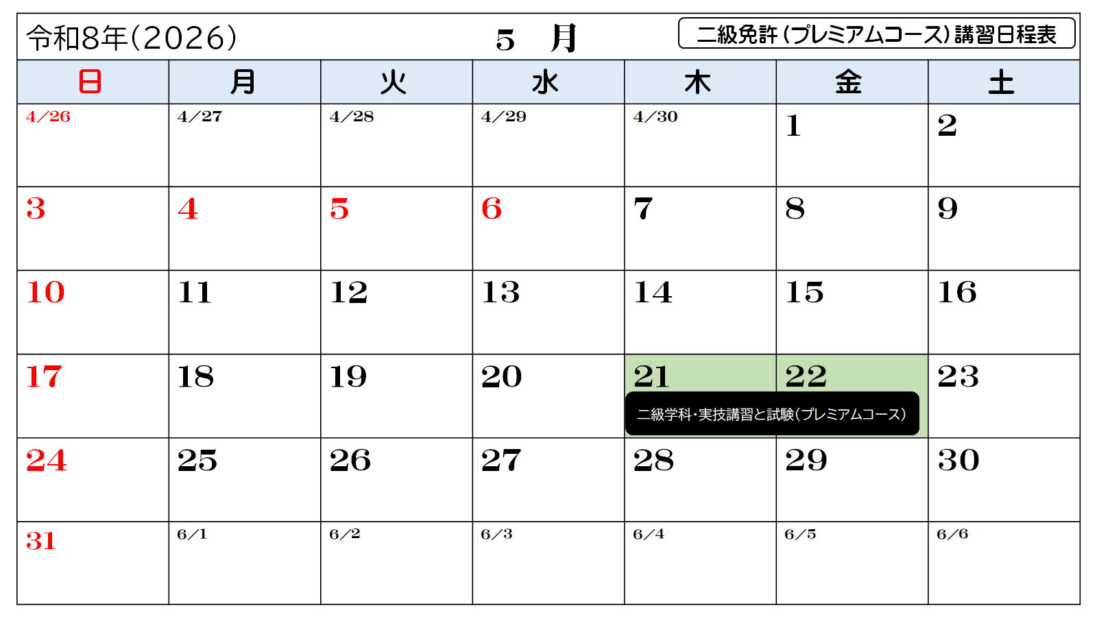 ■下記は、二級免許2日連続コース(プレミアムコース)の講習&試験料です。