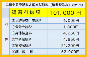 ■下記は二級小型船舶免許(進級)受講の場合の講習料&国家試験料(税込み)