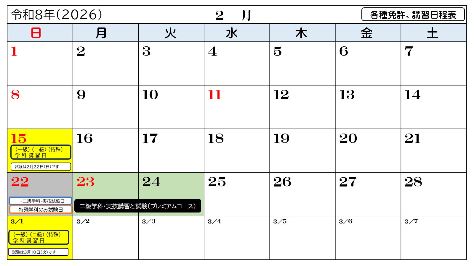 11▲ 一級免許学科、実技講習及び試験日程表 |