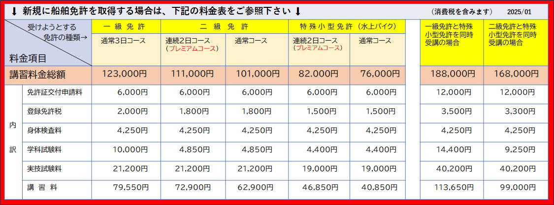 新規に船舶免許を取得される場合は、下記の料金表をご参照下さい。(税込み)↓