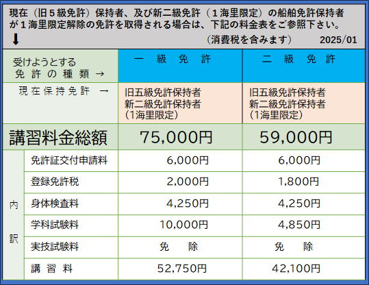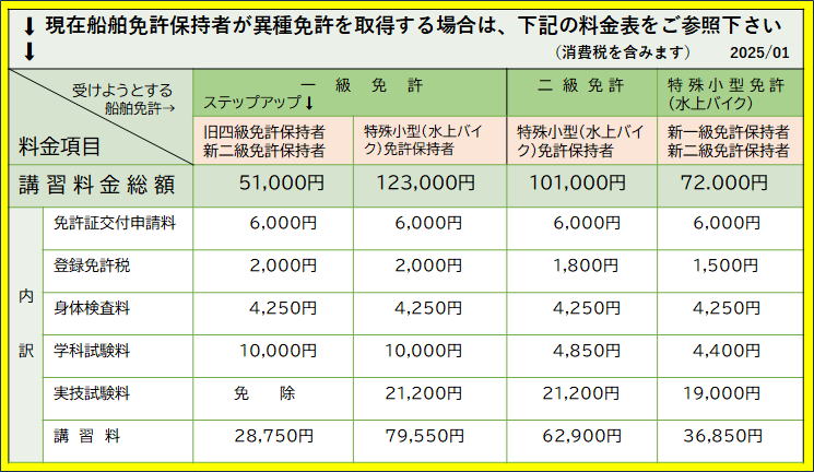 ■現在船舶免許保持者が異種免許を取得される場合は、下記の料金表をご参照下さい