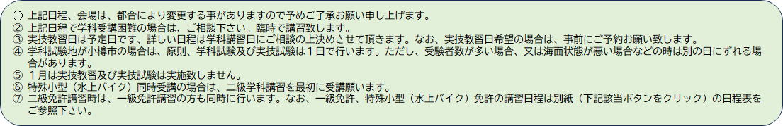 | 07月26日(日) ② | ▶▶07月27日(月)~08月03日(月) | ▶▶08月04日(火) | 8/2実技教習不可 | ||